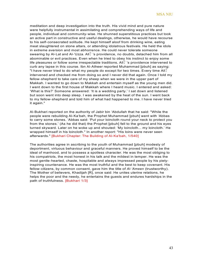 Muhammad (s.a.w.s.) then returned to Makkah and resumed his life, working as a shepherd in his early life. He did not acquire knowledge or education from a monk or a philosopher or sorcerer, as was the norm then. Instead he read through the pages of life and took what he found good. He combined the good qualities of discipline with spiritual purity, rightness and contentment.