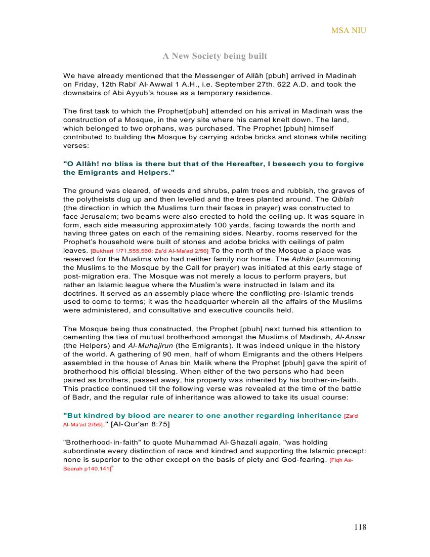 In 622, Muhammad (s.a.w.s.) and his few hundred followers left Mecca and traveled to Yathrib, the oasis town where his father was buried. The leaders there were suffering through a vicious civil war, and they had invited this man well known for his wisdom to act as their mediator. Yathrib soon became known as Medina, the City of the Prophet. Muhammad (s.a.w.s.) remained here for the next six years, building the first Muslim community and gradually gathering more and more people to his side.