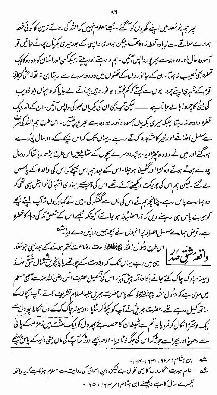 Muhammad (s.a.w.s.) spent five years with Banu Saad during which nothing out of the ordinary happened except one told incident which scared Halimah and became known as “the splitting of his chest.” When he was playing with the other boys Jibril held him, threw him down, split his chest, took out his heart and took out a clump from it and said: “this is Satan's portion of you.” Then he washed him in a basin made of gold with the water of zamzam, then sealed his chest and returned him where he was. The boys ran to Halimah and said Muhammad (s.a.w.s.) has been killed. They came back and found him alive but pale. (Reported by Anas in the Hadith compilations of Muslim and Ahmed)