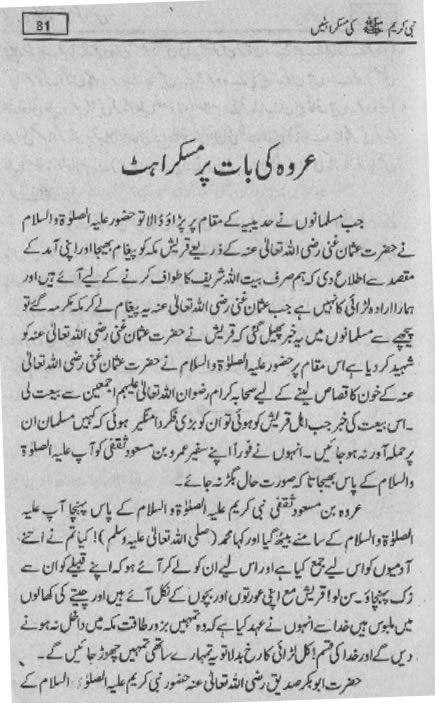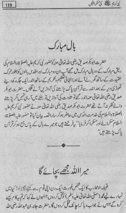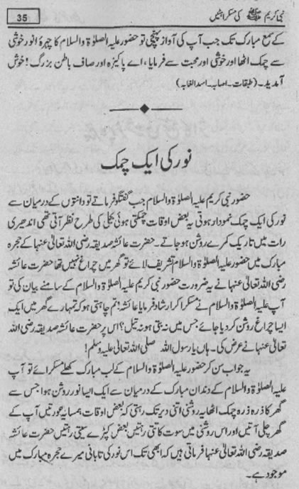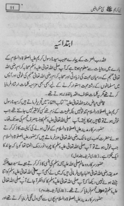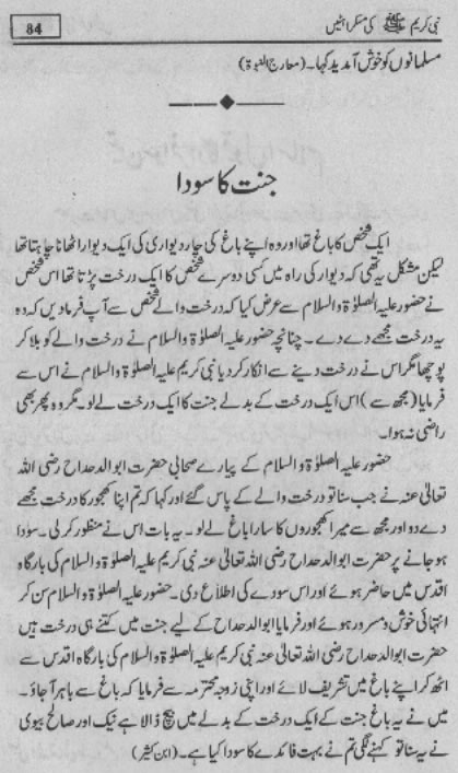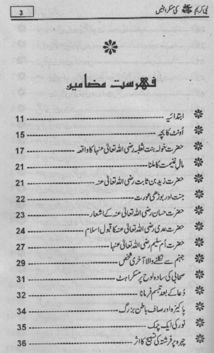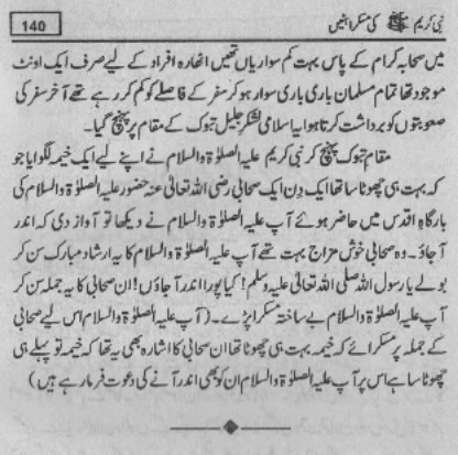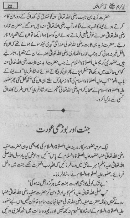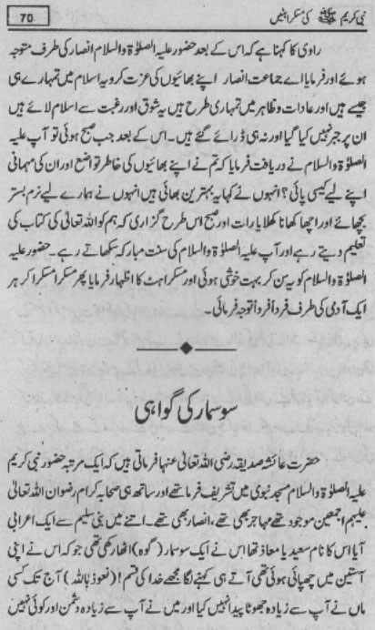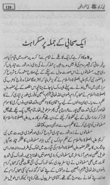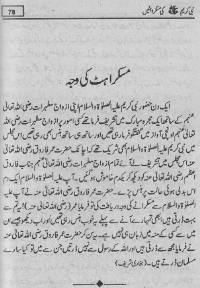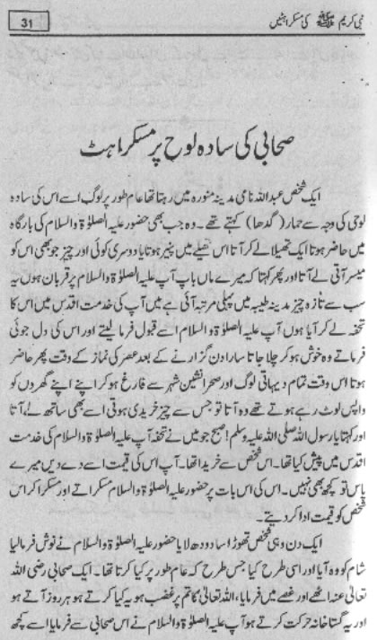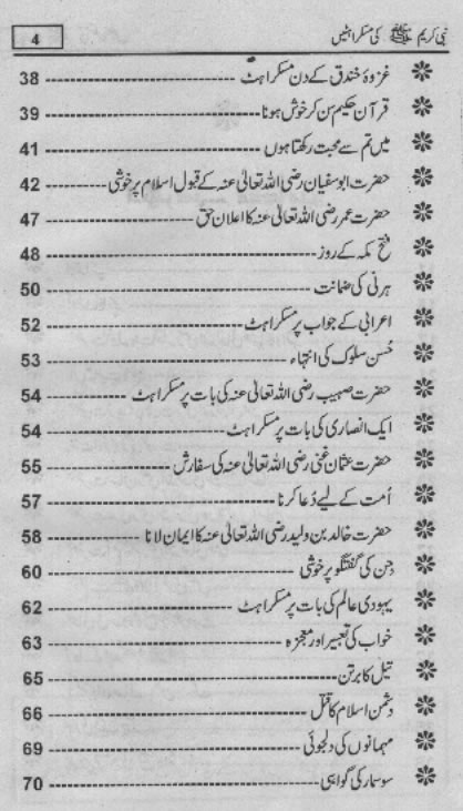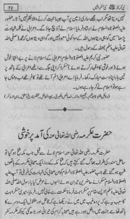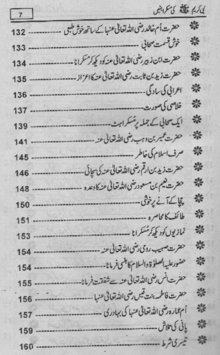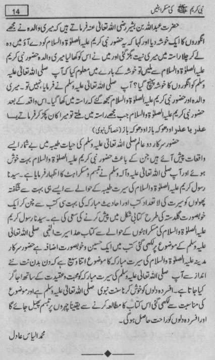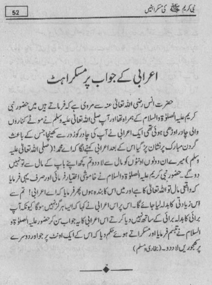 Smiles of Mohammad (pbuh)Here is a book outlining some of the lovely, smiling and beautiful moments of the life of Rasulullah (saw) Mohammad (pbuh). May Allah (swt) grant us the same sweet, smiling, and kind heart. Ameen! Click any of the following links to read the whole book in urdu. Viewing Images (Internet Explorer only): Please setup your browser to view the images 100%. Here is how you can do it in Internet Explorer Browser 5.5 and above; Click Tools --> Internet Options --> Advanced --> Multimedia --> Enable Automatic Image Resizing (Uncheck the box by clicking on it.)